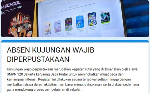 Kepada seluruh siswa SMPN 128 Jakarta, diwajibkan mengikuti kegiatan kunjungan perpustakaan Saung Baca Pintar sesuai jadwal yang telah ditentukan.
